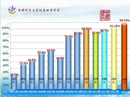 自2003年到今年,高考成績本科上線率整體保持了攀升態勢,體現了我校教學質量提升的強勁持續力(數據對比見下圖表)。
