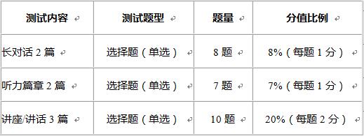 1. 取消短對話,2. 取消短文聽寫,3. 聽力篇章調整為2篇(原3篇),4. 新增講座/講話(3篇)。其他測試內容不變。調整后六級聽力部分的試題結構見下表: