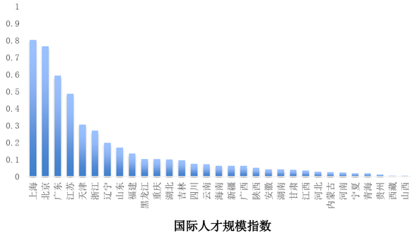 “境外來華工作專家規模指數”反映了來中國境外專家的區域分布情況。研究顯示,廣東是引進外國專家最多的省份(0.82),上海(0.77)、江蘇(0.64)、北京(0.63)分列2-4位。“這與‘來華留學生規模指數’中各區域差異情況相似,說明當前我國國際人才分布的均衡程度相對較差。”王輝耀說。
