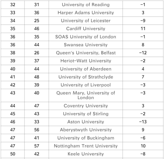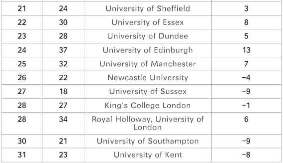 去年不幸跌出前30名的曼徹斯特大學和愛丁堡大學,今年又回到前30的行列。出人意料的是,通常作為中國學生Top30保底學校的格拉斯哥大學,今年從29直接竄到了20。同樣令人驚喜的還有埃塞克斯大學,上升了8個位次,以22名的成績超過了曼大愛丁堡這樣的牛校。