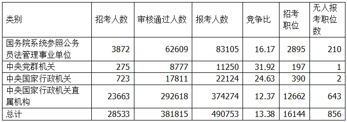 人民網北京11月3日電 (記者 郝孟佳)今天是2018年國考報名第五日,截至下午16時,報名系統已經審核通過了38萬余人,平均競爭比13:1,相比去年14:1略有下降,較昨天下午增加了11萬人。目前共有15288個職位有人報名,中央黨群競爭力度最大,平均32人競爭一個職位。