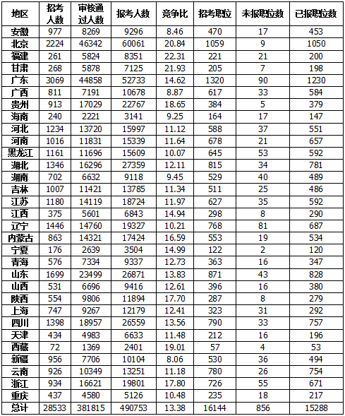 從各地報名情況來看,北京、廣東、湖北、山東、四川、貴州、浙江等省份為較熱的地區,報名人數較多,與這些地區招錄人數多有很大關系。從競爭比來看,福建目前競爭比最高,招錄261人,有8351人通過審核,競爭比為22.3:1,其次為甘肅,北京排第三位。