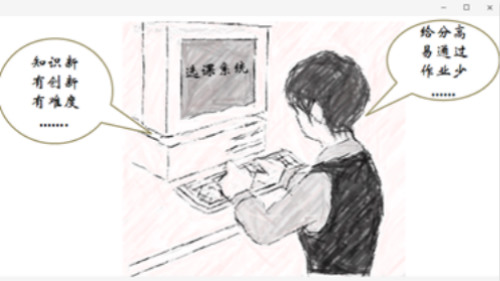 Exhibited in the cartoon is a sarcastic scene that sitting before a computer, a college student is choosing his optional class, wondering and pondering whether he should choose an easier course or a tougher but creative course. Simple as the picture is, the symbolic meaning it conveys is profound and thought-provoking.