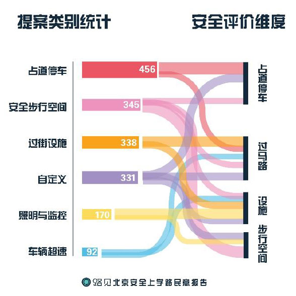 《報告》通過構建佔道停車、過馬路(紅綠燈、斑馬線天橋地道等) 、步行空間(人行道環境)與設施(照明、監控減速帶等)四個維度,整合並解析民意數據,形成北京市各行政區上學路安全性指數的綜合排名。