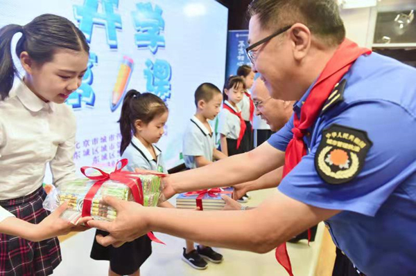 北京市東城區城管局的校外輔導員向學生們贈送普法書籍 圖/學校供圖
