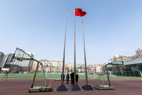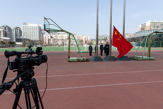 北京匯文中學體育館,校長帶領老師錄制升旗儀式視頻。(記者翁奇羽 攝)