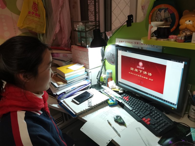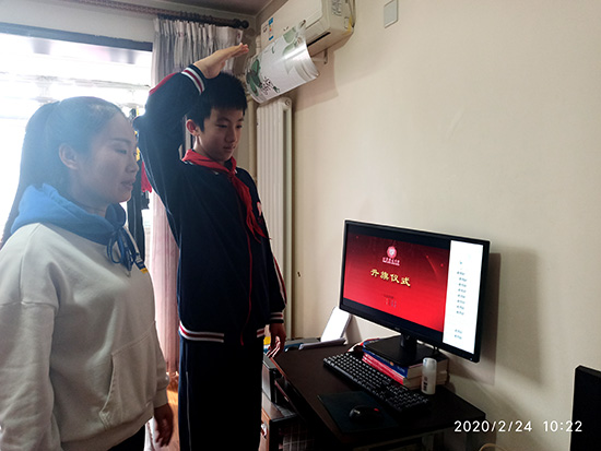 人民網北京2月25日電 (記者 熊旭)昨日,一場線上升旗儀式在北京匯文中學舉行,升旗儀式從操場搬到了網絡上,同學們雖然身處不同的地點,但身著相同的校服、佩戴著紅領巾或團徽,在相同的時間,共同唱響雄壯的國歌,共同聆聽國旗下講話。家長們、老師們也共同參與,一起感受這激動人心的時刻,這一刻,家國情懷在每一名匯文人的心中迸發。