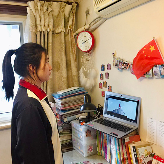 高二3班趙蕊在家收看升旗儀式(學生家長供圖)