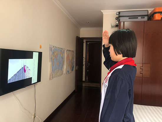 初一7班金子晴在家收看升旗儀式(學生家長供圖)
