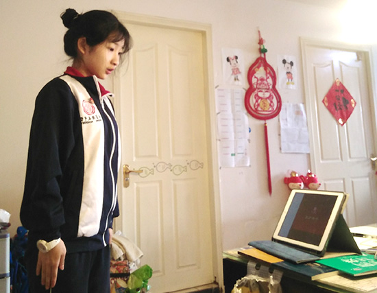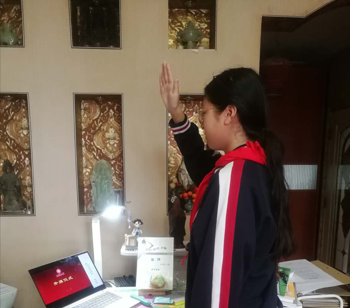 初二6班王雪瑩在家收聽升旗儀式結束后的“國旗下講話”。(學生家長供圖)