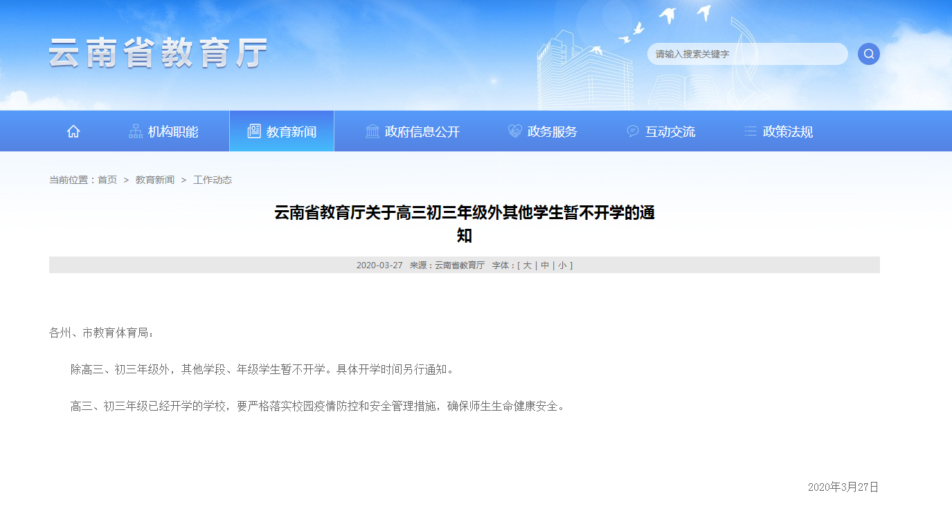 人民網北京3月28日電 據雲南教育廳網站消息,雲南教育廳27日下發通知指出,除高三、初三年級外,其他學段、年級學生暫不開學。具體開學時間另行通知。