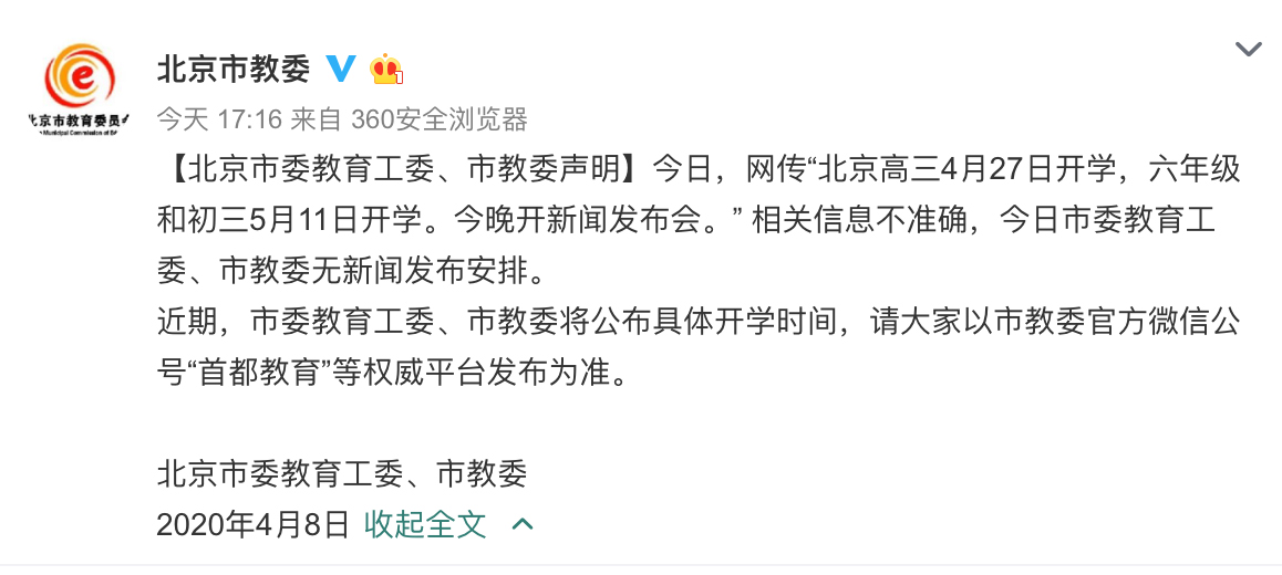 北京市教委:網傳“北京高三4月27日開學” 等信息不准確