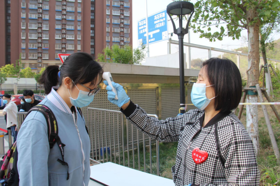 人民網北京4月28日電 27日早上7點,北京市大峪中學迎來了第一名到校的學生。高三學子們結束了“超長假期”,抑制不住興奮的心情,迫不及待的重返校園。在門頭溝區四所高中校,孩子們與班主任“隔空擁抱”、“歡迎回家”的小紅心胸貼、每個學生的桌子上的祝福語,讓這個開學別樣的溫馨。