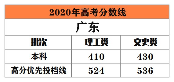 廣東 本科最低控制線:理工類410分﹔文史類430分﹔高分優先投檔線:理工類524分,文史類536分。