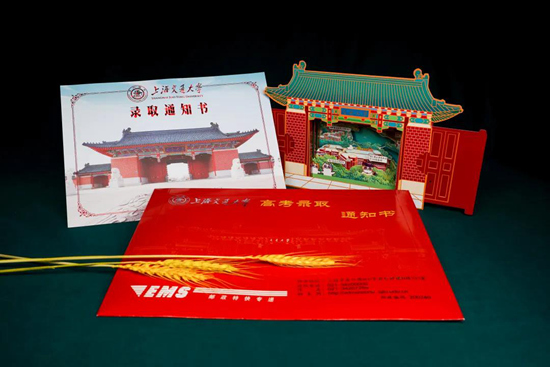 上海交通大學錄取通知書正面以“紫氣東來門”為背景,“交通大學”四字門匾熠熠生輝。校門卡外形為交大校門,以“交大紅”為主色調,採用別出心裁的抽拉紙雕形式,在未拉開時為關閉的平面交大校門形象,拉開時緩緩變為立體五層紙雕,美麗的校園內景也隨著校門的拉開而逐漸流露呈現。新生大禮包中,中國工程院院士、上海交通大學校長林忠欽也送上深情寄語,勉勵即將入學的學子繼承交大傳統,磨煉本領、砥礪前行。