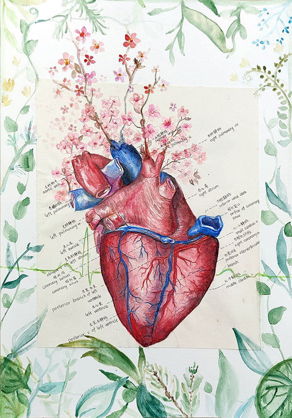 作者劉星廷解讀:作品以富有生命力的心臟借由科技與人類對話作為主題,選取心電圖和表面血管分布明顯的心臟后面觀,既突出心臟的血液充盈和立體感,又表現出一腔熱血、生機勃勃的涵義。畫作主要利用水溶性彩鉛、馬克筆和水彩,以寫實心臟為中心主體,上方伸展出紫葉李花束,背景為一周期正常的健康心電圖,圖畫上層為對實體心臟按比例放大繪圖后的標注。