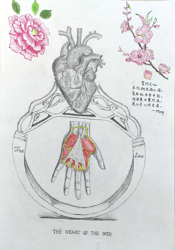 作者吳城箭解讀:誓約之戒,以心為鑽,為愛加冕。作品由心臟鑲嵌的戒指和一隻托舉的手構成,象征著真心的托付﹔左右配以牡丹和桃花,寓意著牡丹亭和桃花扇兩個關於愛情的典故。作品中有英文、古詩、花朵和器官等元素存在,體現了醫學是一門以中西醫體系為主、發展歷史悠久的學科,也代表著醫學是自然科學、社會科學和人文科學的統一體。