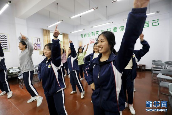 5月18日,湖南省資興市立中學的高三學生在跳舞減壓。