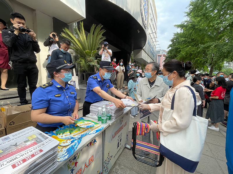 海澱城管人員在人大附中考點門口設置高考愛心服務站,為考生和家長服務。人民網 尹星雲攝
