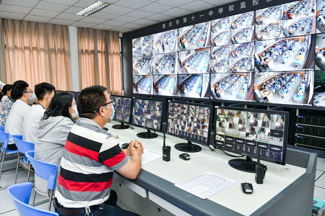 重慶十一中考點監控室,考務人員對考場進行實時監控。鄒樂攝