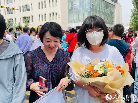 第一場考試結束,陪考家長在考點外焦急等候,為考生送上鮮花。人民網 張聿修攝