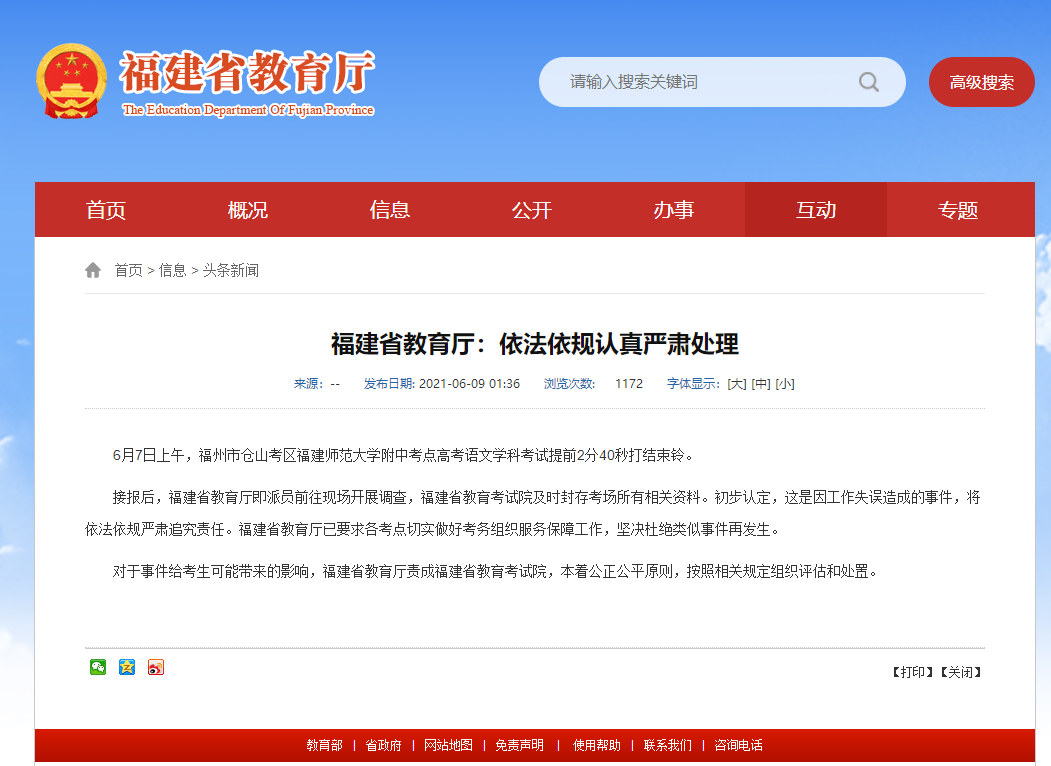 通報中稱,對於事件給考生可能帶來的影響,福建省教育廳責成福建省教育考試院,本著公正公平原則,按照相關規定組織評估和處置。