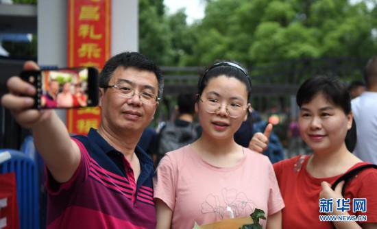 6月9日,在湖南省長沙市一中考點外,考生(中)在考試結束后與父母合影。