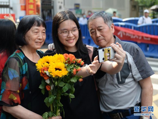 6月9日,在湖南省長沙市一中考點,考生在考試結束后與家人合影。