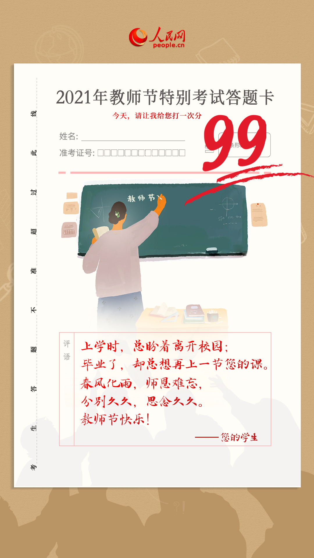上學時,總盼著離開校園﹔畢業了,卻總想再上一節您的課。春風化雨,師恩難忘﹔分別久久,思念久久。今天,讓我們用特別的考試答題卡,一起為青春時間的老師打一次分,祝願老師節日快樂!