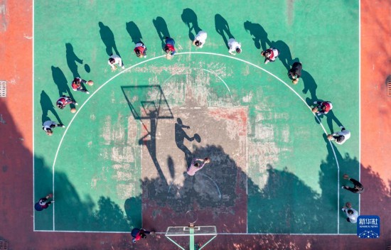 12月21日,學生在貴州省黔西一中上籃球課(無人機照片)。