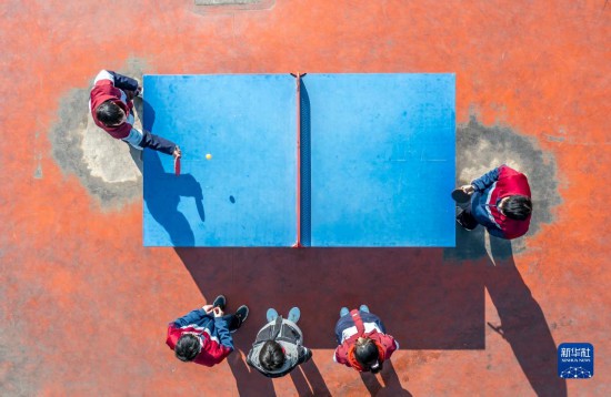 12月21日,學生在貴州省黔西一中練習乒乓球(無人機照片)。