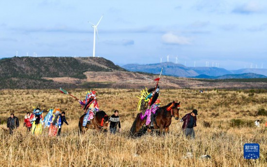 2月7日,龍裡太平花燈戲的成員前往村子附近的山頂練習花燈戲。