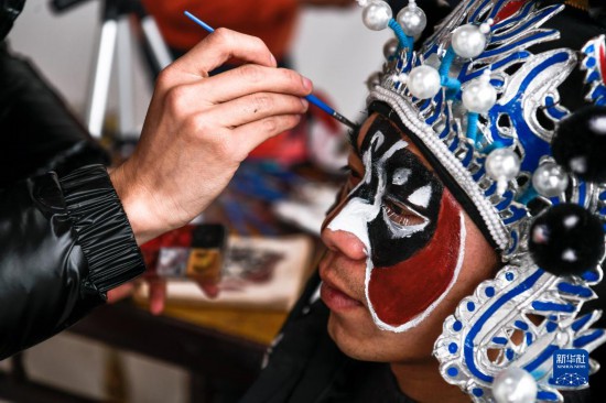 2月6日,龍裡太平花燈戲的成員在表演前化裝。