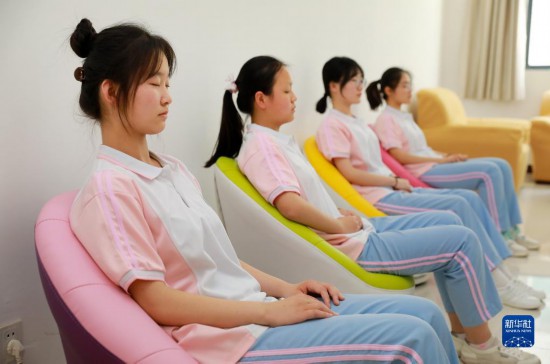 5月26日,在安徽省淮北市第十二中學校園心理健康輔導站,學生坐在“放鬆椅”上放鬆。