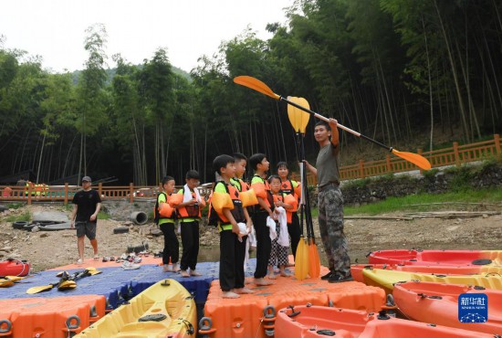 8月1日,小學生在位於紹興市富盛鎮的水上運動基地參加皮劃艇拓展活動。