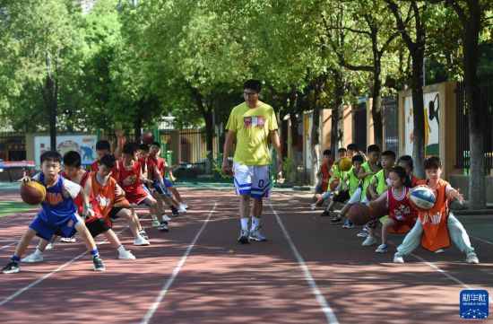 8月11日,在合肥市蜀新苑小學暑期托管班裡,學生在老師指導下學習籃球。