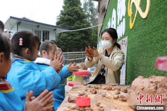 武勝縣賽馬鎮第二幼兒園老師教孩子們做泥塑。 王林 攝