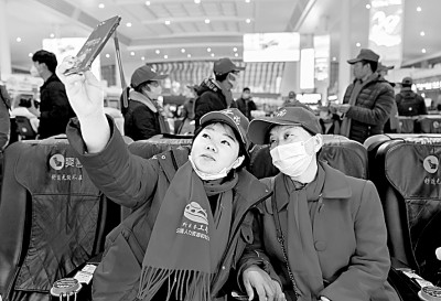 雲南暢通返崗就業通道。圖為兩名務工人員在昆明南站候車廳候車時拍照。新華社發