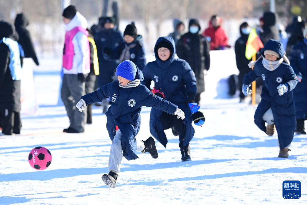 12月21日,小朋友在內蒙古呼倫貝爾的城市越野滑雪公園參加雪地足球游戲。