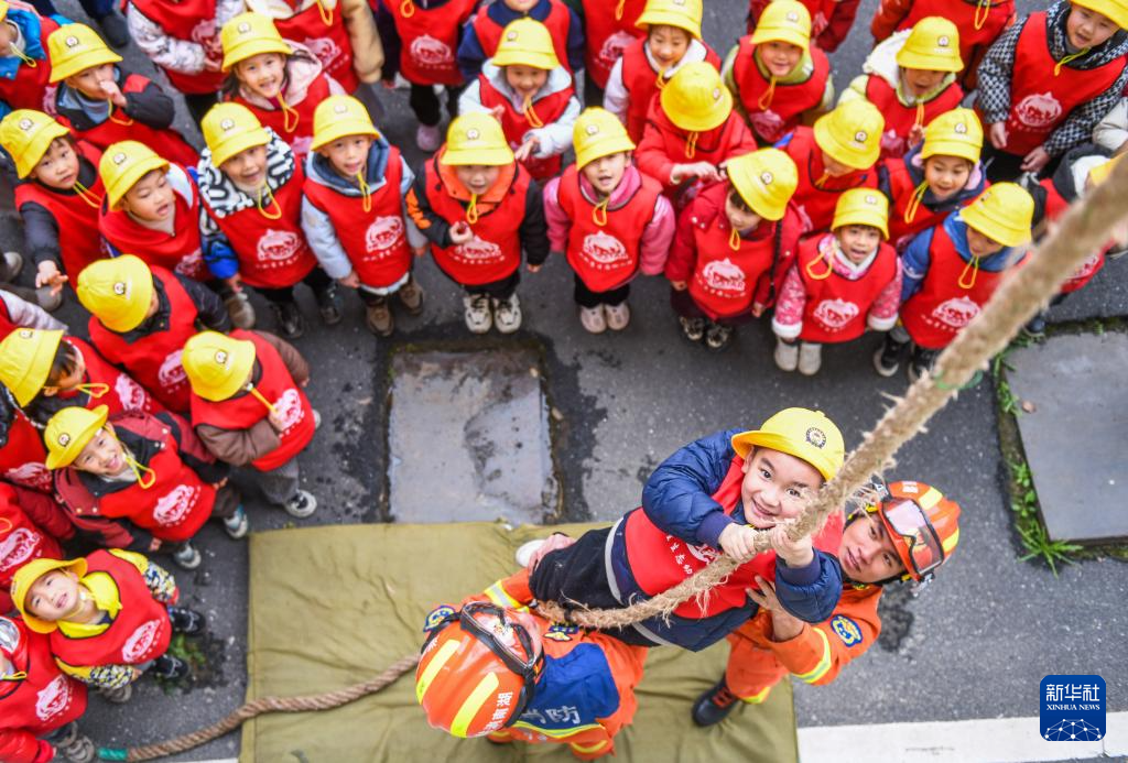 3月31日,在湖南省永州市道縣消防救援大隊,小朋友在消防救援人員的協助下體驗繩索攀爬技能。
