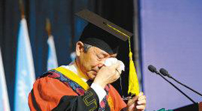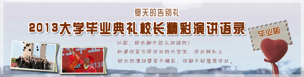 “教師、學生是大學的主體,辦大學的目的就是要培養人才。學校在畢業生離校前夕,舉行畢業典禮和學位授予儀式,就是要再一次把人文關懷送給他們,讓他們重溫過去幾年的大學春秋,並對未來的夢想更加充滿信心。”【詳細】你們讓我學會“給跪了”與“傷不起”等流行語。生活就是笑笑別人,順便再讓別人笑笑。你們說,心自由,生活就自由,要學會聽進去批評意見﹔你們還會發現,想贏得尊重先要學會尊重,快樂不在於得到的多,而是計較的少、包容的多,因為你們說,心簡單,世界就簡單,幸福才會生長。而重要的是養健康的人格,因為它將改變命運。【詳細】
