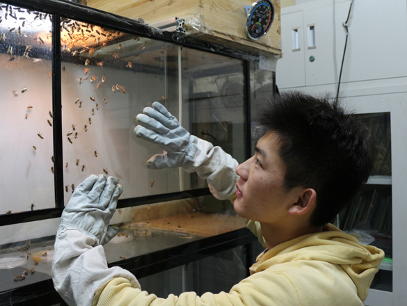 但如何让“尊贵矫情”的蜜蜂小姐开口喝水,却把杨珩难住了,他尝试把蜜蜂用老鼠贴粘在玻璃片上,把蜜蜂胡乱挥舞的手脚束缚起来,把蜜蜂放在一个小盒子里只开一个喝水的小孔等等,均以失败告终。就这样,杨珩从早晨尝试到傍晚,不吃不喝地逗蜜蜂喝水,手被蜜蜂蛰肿了,仍没有成功。挫败感并没有打败杨珩,最后的坚持让他幸运地遇到了一只给力的蜜蜂,它疯狂地喝水,使杨珩从各个角度清晰地观察了“蜜蜂喝水”的一举一动,拍摄到了珍贵的视频资料。“这个实验完成后,我们欣喜若狂,把蜜蜂都放生了,尽情地让蜜蜂蛰我们!也许,热爱自然,坚持信念的人,老天也会给我们好运吧!”直到现在,我们仍能感到杨珩成功的喜悦。