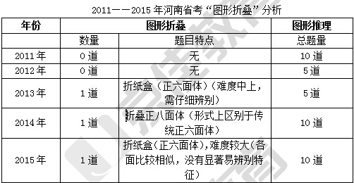 近5年河南省公務員考試除了2011年、2012年沒有涉及“圖形折疊”這一考點,其余年份均對這一考點進行了考查,且題量均為1道題,題目具有一定難度。很明顯,圖形折疊已經成為河南省考圖形推理中最基本的考點之一,這就要求應試者在備考中一定要將此考點作為復習備考的重點之一。
