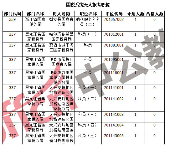2017國考國稅系統37個部門共提供9455個職位,招錄17476人。截至24日17:30,總報名審核通過人數為756571人,競爭比例為43:1,仍有10個職位無人報考,在這10個職位中有9個來自黑龍江省國稅系統,剩下的一個來自浙江省國家稅務系統。下面是中公教育統計的國稅系統報名情況,供考生參考: