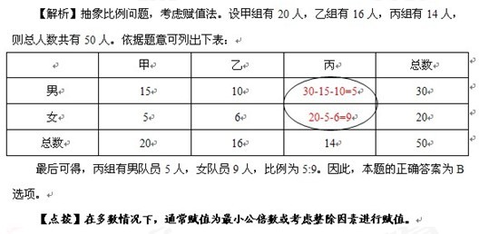 【例5】某调查队男女队员的人数比是3:2,分为甲乙丙三个调查小组。已知甲乙丙三组的人数比是10:8:7,甲组中男女队员的人数比是3:1,乙组中男女队员的人数比是5:3,则丙组中男女队员的人数比是:( )