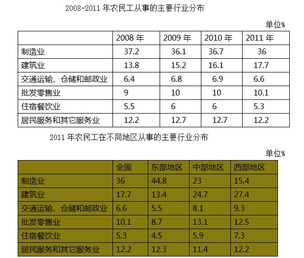 四、2011年全国农民工总量达到25278万人,比上年增加1055万人,增长4.4%。农民工从业仍以制造业、建筑业和服务业为主,从事建筑业的比重明显提高。从农民工的就业地区来看,2011年在东部地区务工的农民工为16537万人,比上年增加324万人。在中部地区务工的农民工位4438万人,比上年增加334万人,增长8.1%。在西部地区务工的农民工4215万人,比上年增加370万人,增长9.6%。