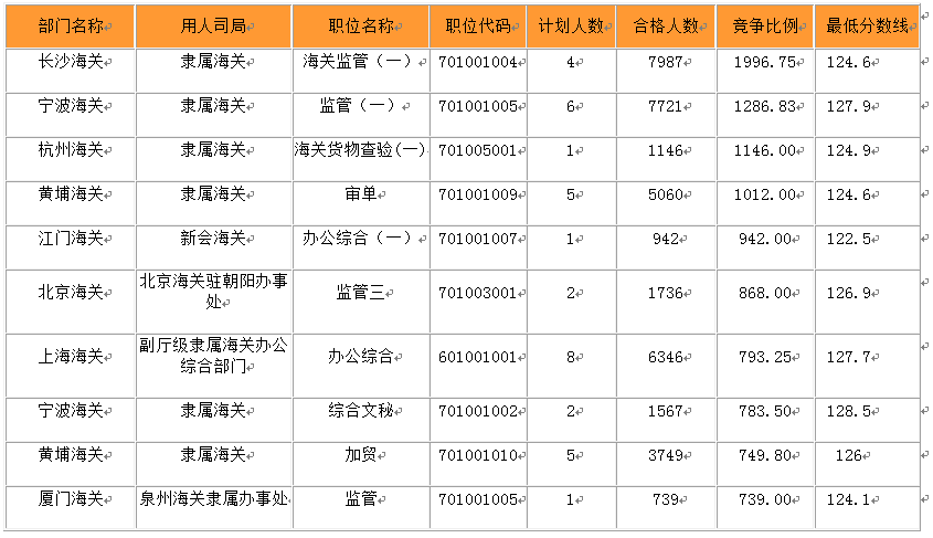 2014国家公务员考试海关竞争比例前十职位及分数线