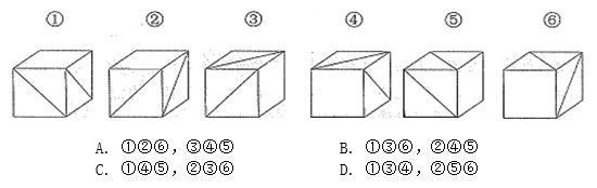 【答案】B。解析:本题考查对角线的方向。观察六个图形,每一个图形均为一个立方体,且有两个面中含有对角线,不同的是对角线的方向。如果按照两个面横向排列的角度来看,图形①③⑥中,对于含有对角线的面来说其对角线的方向均是“从左上至右下”;图形②④⑤中,其对角线的方向均为“从右上至左下”。即图形①③⑥是同一个立方体不同的角度,②④⑤是同一个立方体不同的角度。故选B。
