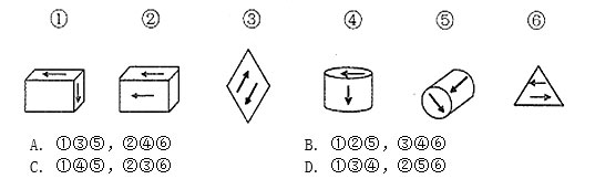 【答案】C。解析:本题考查位置关系。每一个图形均为一个几何体中含有两个箭头:单独考虑几何图形,除③⑥是平面图形外,其他四个均是立体图形,因此按照几何体的特性并不能将图形分成两组,那么本题的研究重点就是“两个箭头”。进一步观察发现,①④⑤中的两个箭头是相互垂直的关系,②③⑥中两个箭头的位置是相互平行的关系。故选C。