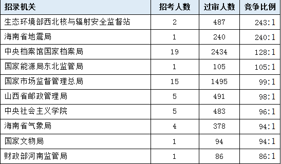 竞争最激烈部门与昨日相比,前十榜单进出变动不大,竞争力度最强的依然是生态环境部西北核与辐射安全监督站,目前竞争比已经达到243:1,其次是海南省地震局,以240:1的微弱差距暂居第二位,前两名竞争力度都比较大,远超其他部门。